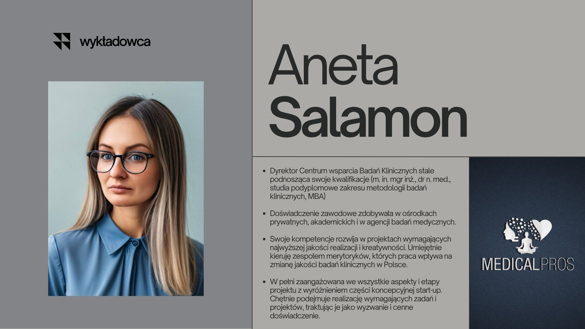 Dyrektor Centrum wsparcia Badań Klinicznych stale podnosząca swoje kwalifikacje (m. in. mgr inż., dr n. med., studia podyplomowe zakresu metodologii badań klinicznych, MBA)